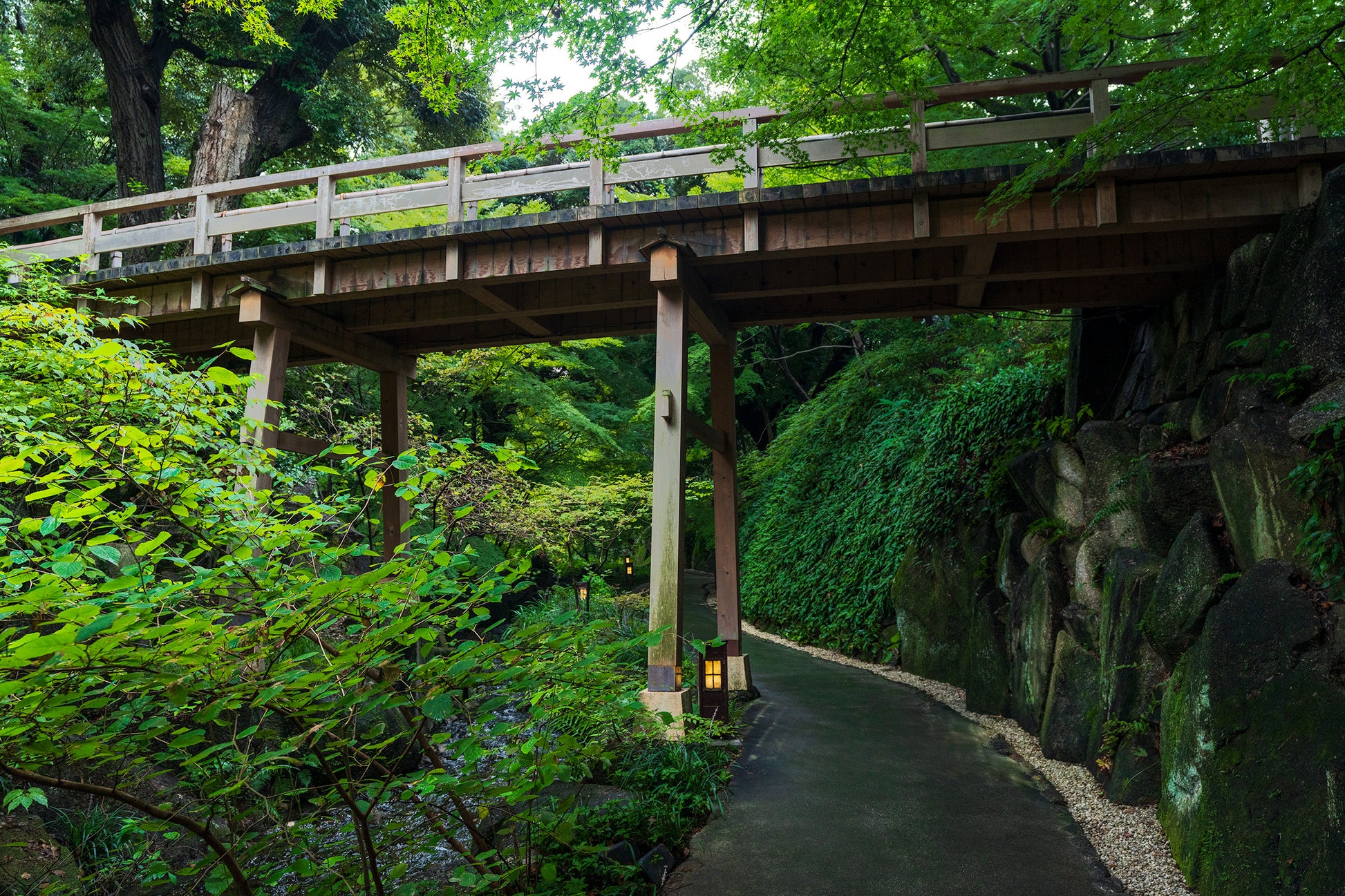 This garden features delicate wooden bridges and walking paths lined with stone lanterns