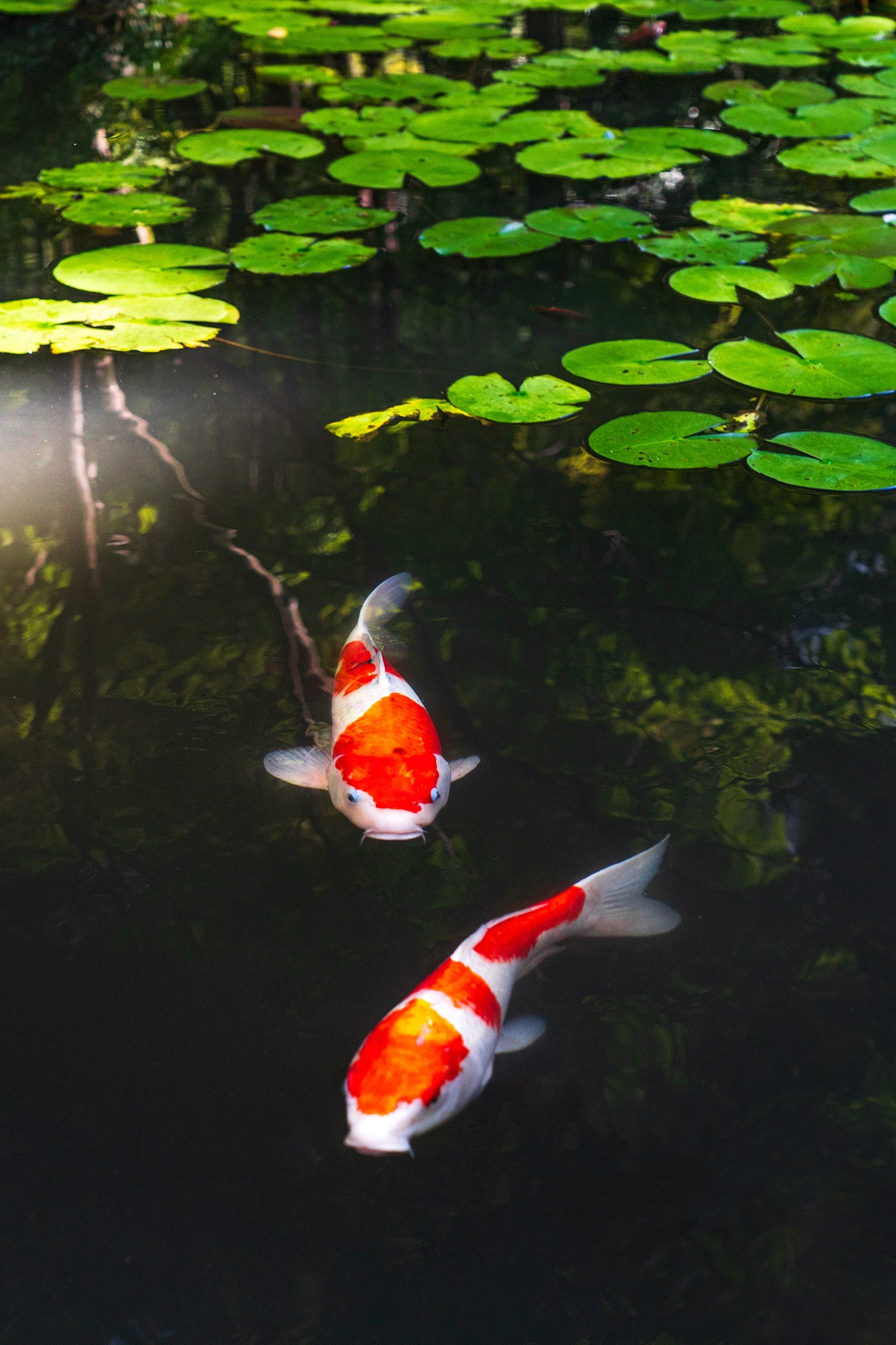 Two Koi fish swimming together in the Koi pond at Tenjuan Temple