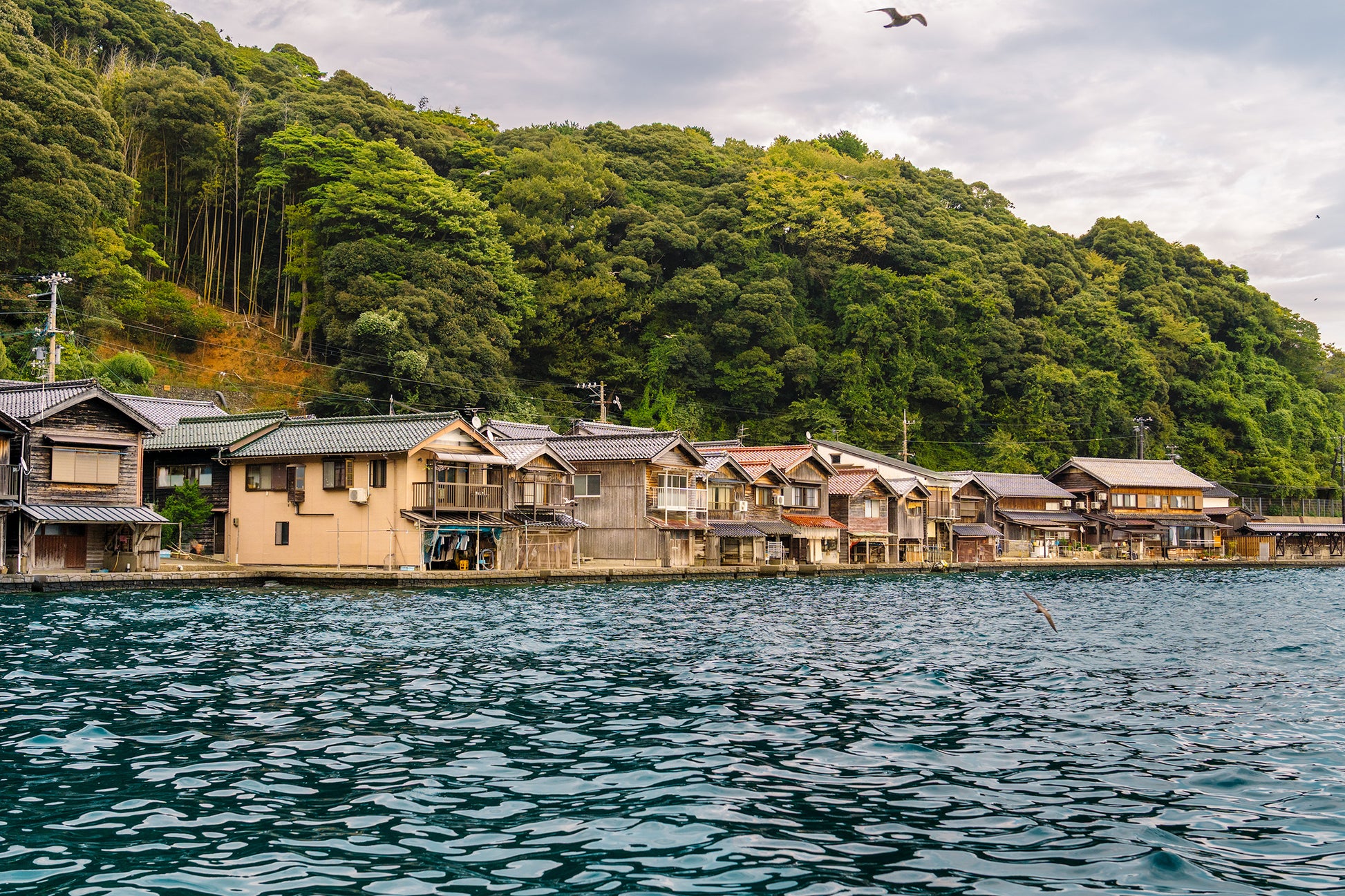Boathouses, called "Funaya," on the water of the Ine Bay in the northern Kyoto town of Ine
