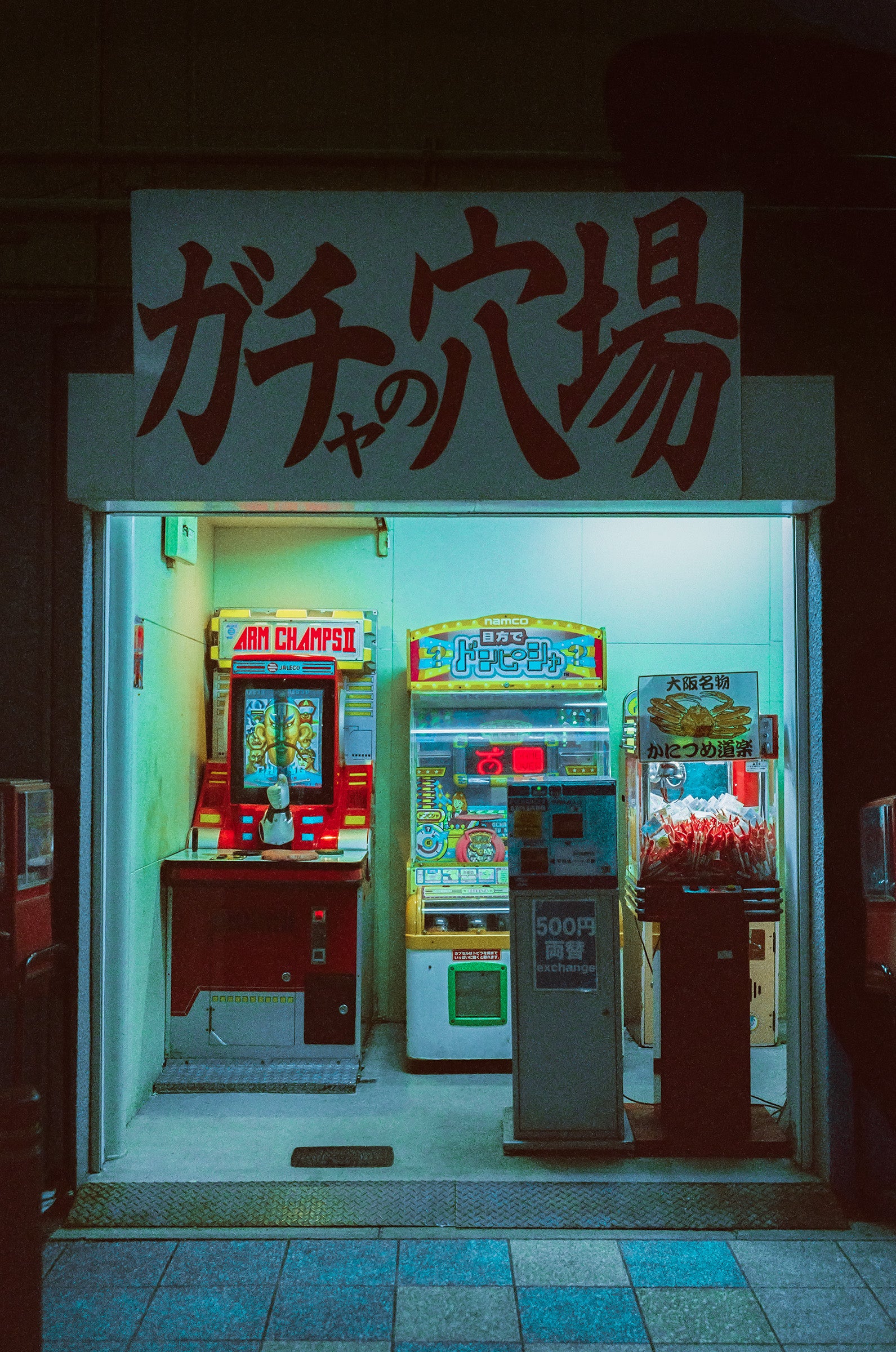 A hole in the wall arcade in the Shinsekai district in the late hours of the night.