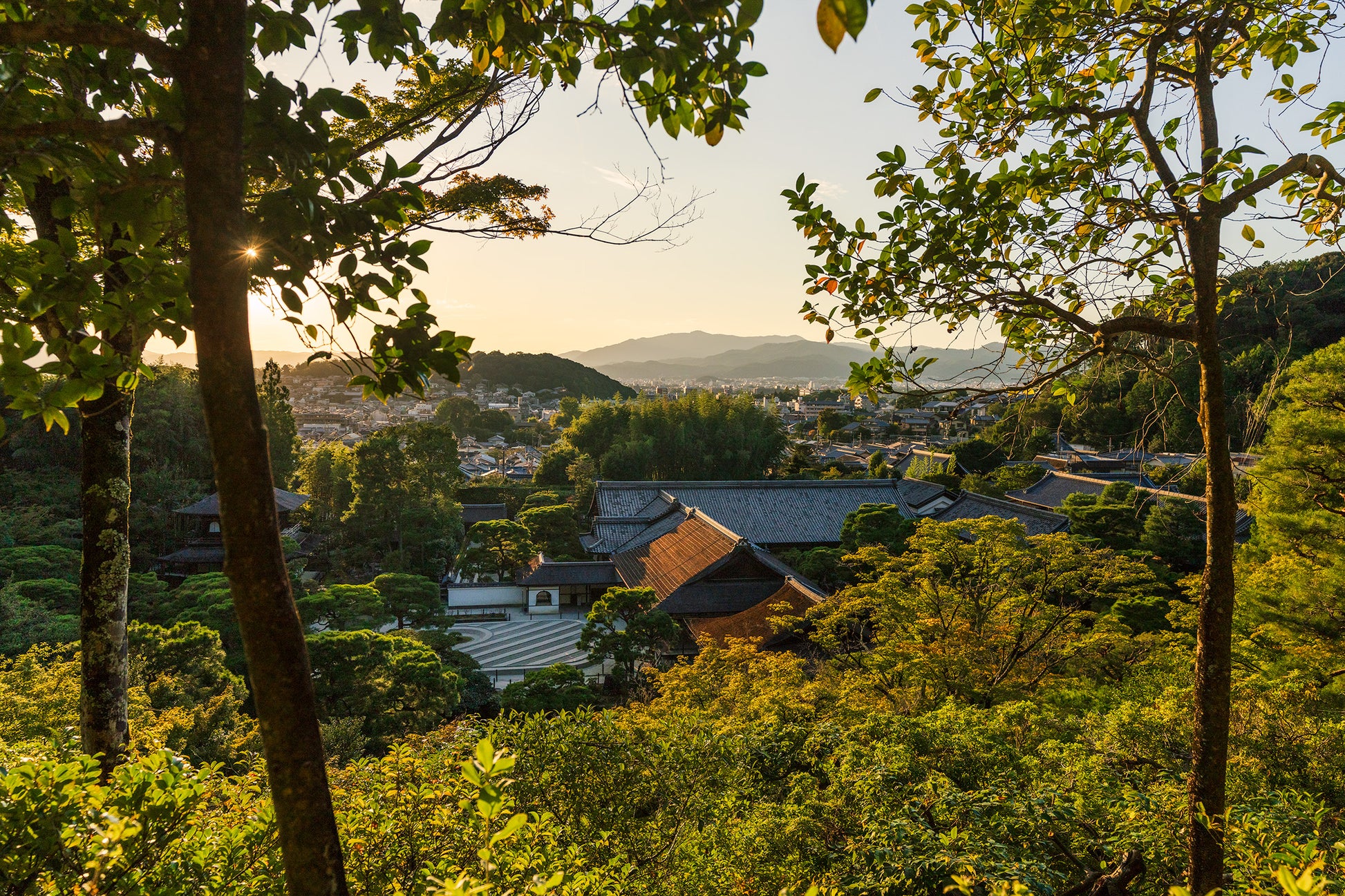 The sun pokes through trees atop a hill providing the perfect view of Jisho Ji Temple