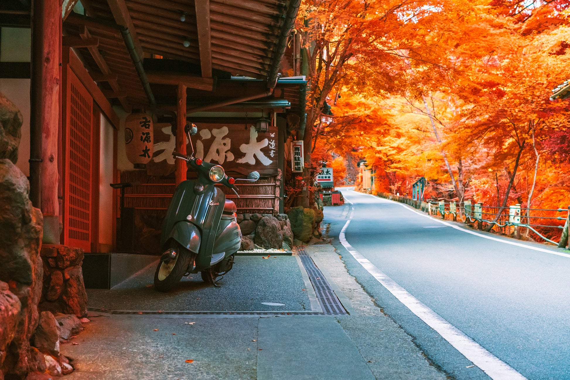 A moped, parked beside a ryokan, known as a traditonal inn, in this quiet mountain town