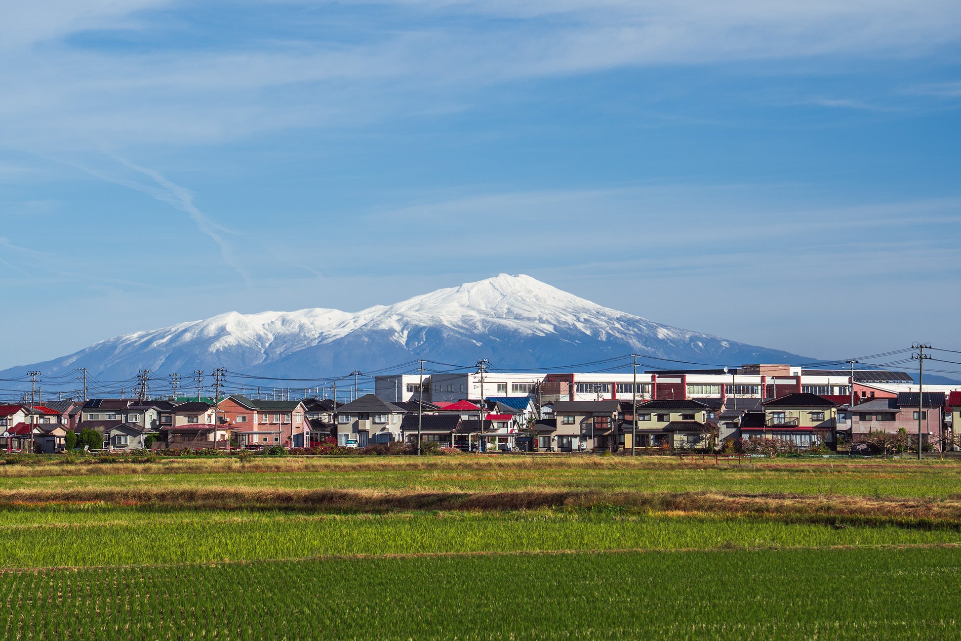 Mount Chōkai, the tallest mountain in the Yamagata prefecture, stands tall and covered in snow, as a backdrop to a neighborhood and field in Tsuroka.