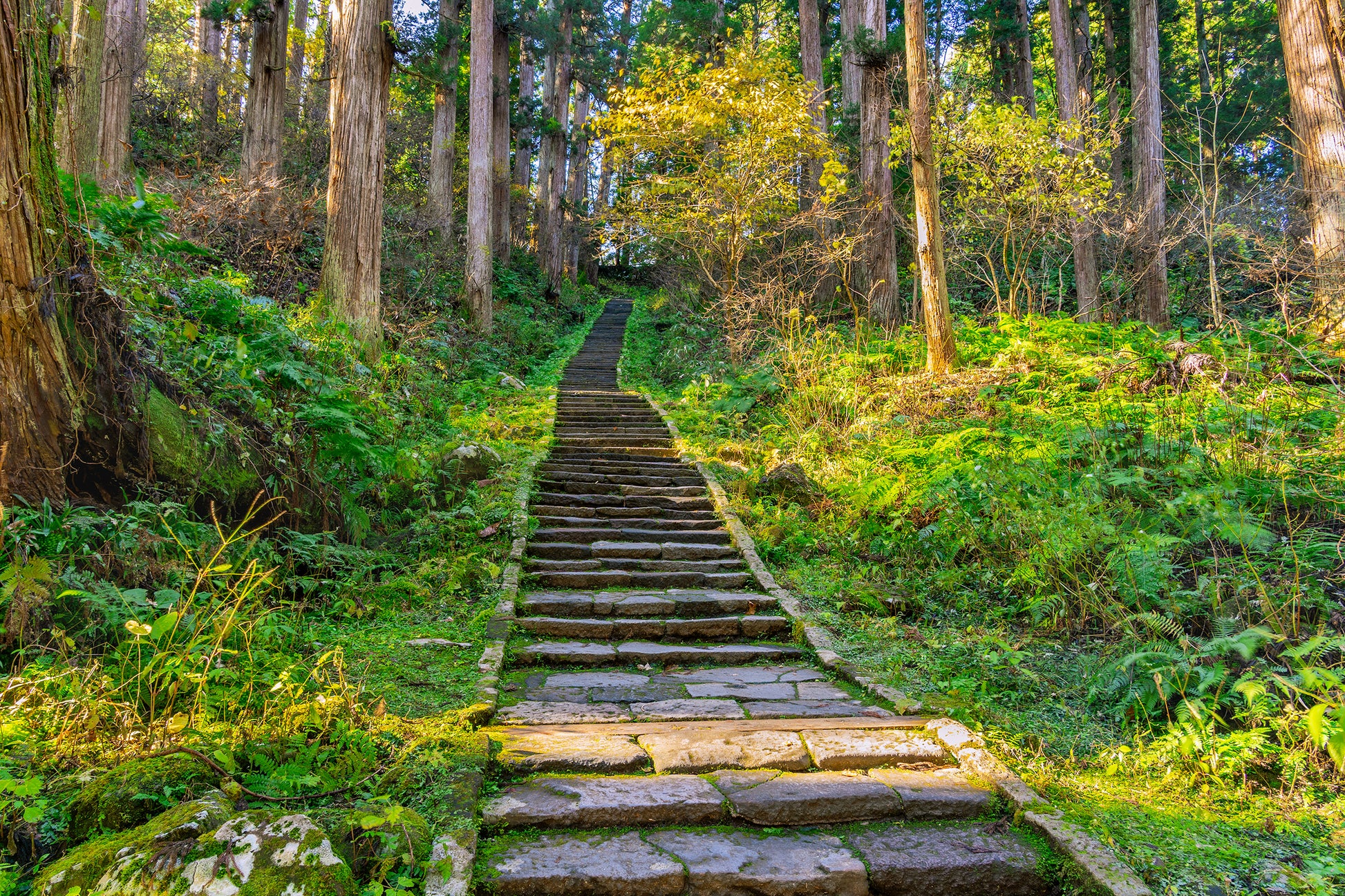 These steps lead to Mt. Haguro, which is the start of a sacred pilgrimage known as the Journey of Rebirth that involves traveling through the present, past, and future.