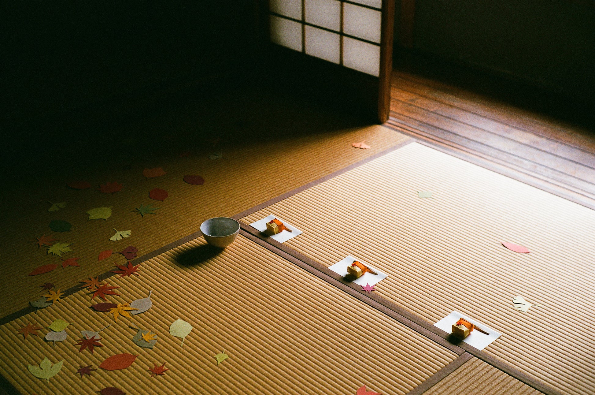 A staged display of a tea ceremony shown in an traditional Japanese room with tatami mats