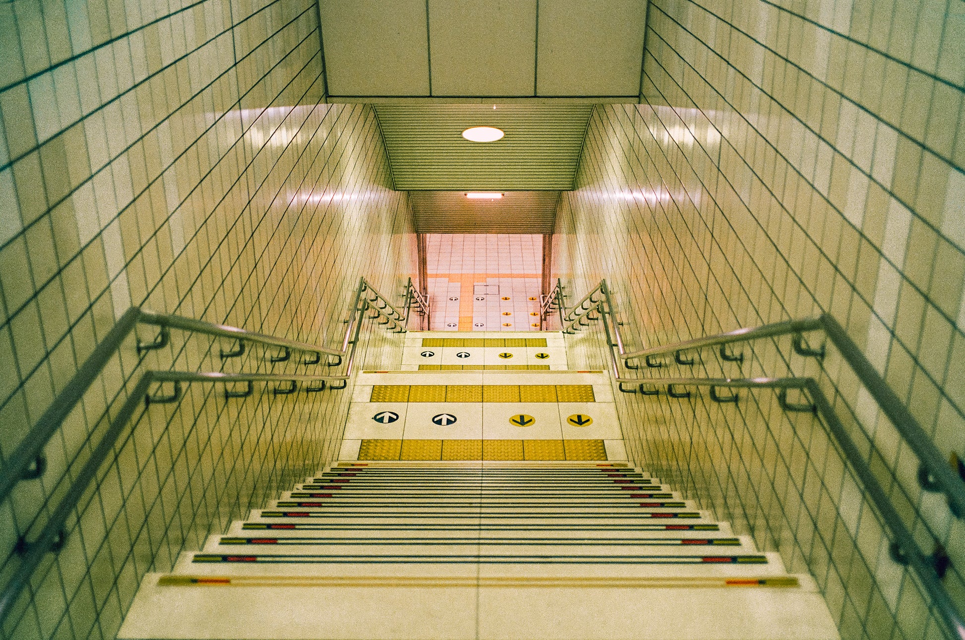 The stairs leading down to a train station, vacant in the late hours after closing.